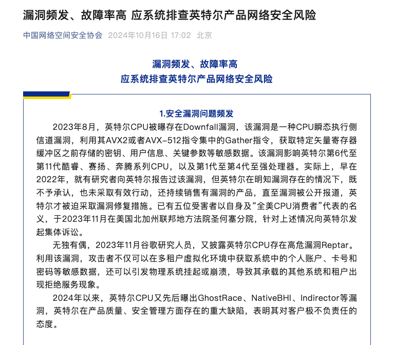 Intel摊上事儿了!近日,中国网络空间安全协会官方发布了一篇文章: