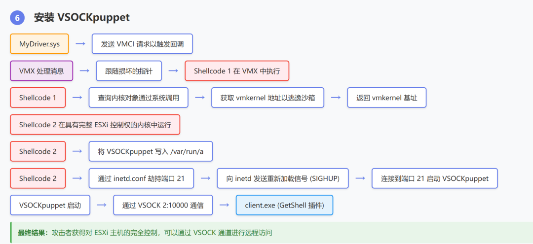 黑客利用攻击代码通过触发VMCI回调让VMX执行已被劫持的流程,在宿主机内核中定位并获得vmkernel的关键地址以完全脱离沙箱限制,随后以内核级权限把一个后门组件VSockpuppet写入系统并注册到服务体系中,这款恶意软件通过虚拟套接字VSOCK实现通信, 该接口是一种专为主机与客户机交互设计的高速通信通道。黑客劫持这一通道后,构建出一条隐秘的命令执行链路,彻底绕过了传统的网络监控手段。