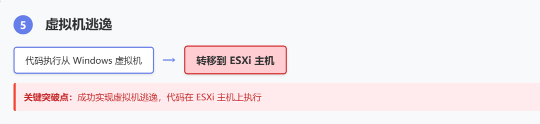 当恶意代码已经被植入并接管了VMX的执行流后,原本只应在 Windows 虚拟机内部运行的指令就会被VMX带到了更高权限的宿主机上下文中执行,从而打破虚拟机与宿主机之间的隔离边界,使攻击逻辑从来宾系统“跳”到了ESXi主机上运行,这一步标志着虚拟机逃逸真正发生。其执行流程如下: