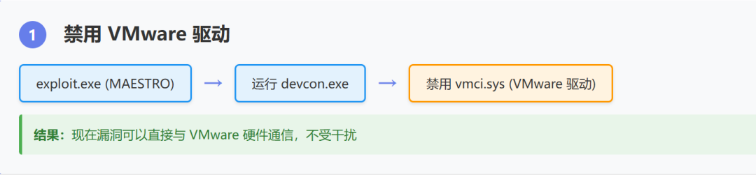 黑客首先上传了一个主控程序:exploit.exe,该程序执行后会禁用VMware原生驱动程序以获取硬件的直接访问权限,其执行流程如下: