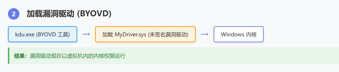 禁用VMware驱动后,黑客再利用“自带易受攻击驱动程序”(BYOVD)技术,将一个未经签名的恶意驱动程序MyDriver.sys加载至Windows内核中,虚拟化管理程序一旦存在漏洞,攻击者就能够突破客户机虚拟机的限制,进而攻陷主机上承载的所有业务负载。其执行流程如下: