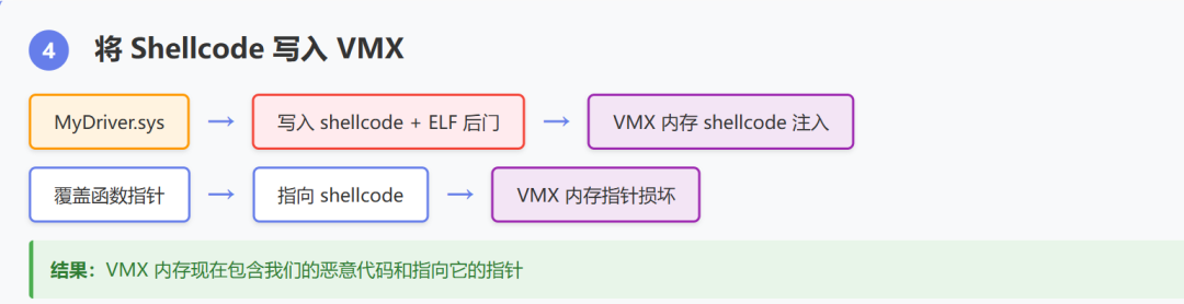 在已经掌握了VMX内存位置之后,由黑客控制的组件(如MyDriver.sys)就可以把一段包含恶意逻辑的代码写入到VMX进程的内存空间中,并通过篡改关键函数指针或回调地址,把原本应当执行的正常流程“重定向”到这段新写入的代码上,从而使VMX在后续运行时自动跳转并执行这些被植入的指令,结果就是VMX的内存里同时存在了攻击者的代码以及指向它的控制指针,VMX 自身的执行流被悄悄劫持并受攻击者控制。其执行流程如下: